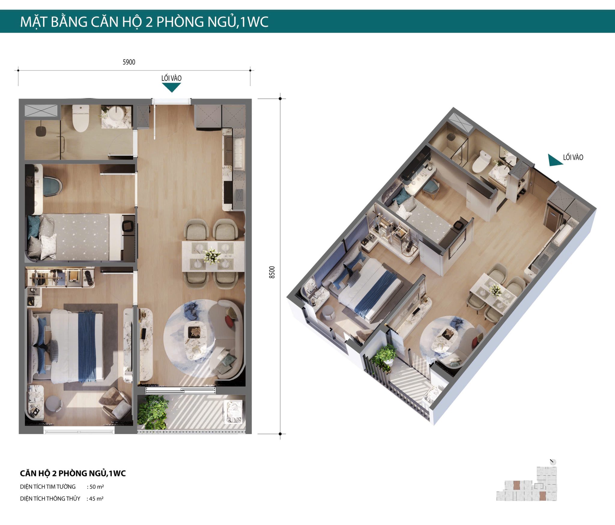 ✅ Bố trí linh hoạt, hai phòng ngủ đảm bảo sự riêng tư, không gian sinh hoạt chung rộng rãi, dễ dàng tùy biến theo nhu cầu sử dụng.